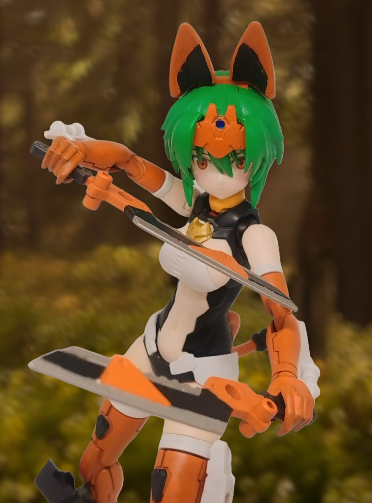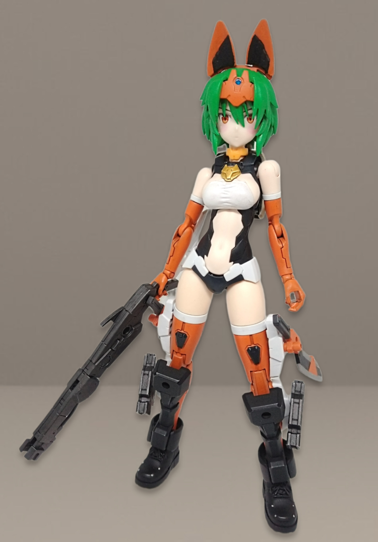 元になっているのはアルカ=カルティですが、ボディはオプションボディをメインにしてピュアオレンジやマットブラックでカラーリングを行い、30MMの各種ウェポンや相互パーツのブーツ部位を装備、大きな耳の部位だけはガンプラのジャンクパーツ売り場で見つけたものを装備させ、山猫=リンクスをイメージして作り上げました。