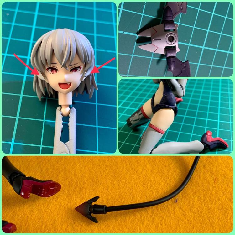 加工は穴埋めとヘアパーツの隙間が気になり、ランナーを利用してヘアパーツを作成。 少し盛りました。 背中の羽は無理矢理カットして装着できるようにしました。 尻尾は作成しています。