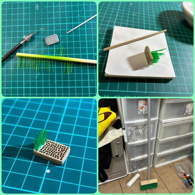 デッキブラシはプラ板で土台を作り、その後は1つ1つ 植毛する様に移植しました。 イマイチブラシの毛が決まらず、100円ショップで本物のデッキブラシを購入してしまいましたw。 この後、このデッキブラシどおしようか…困ってますw