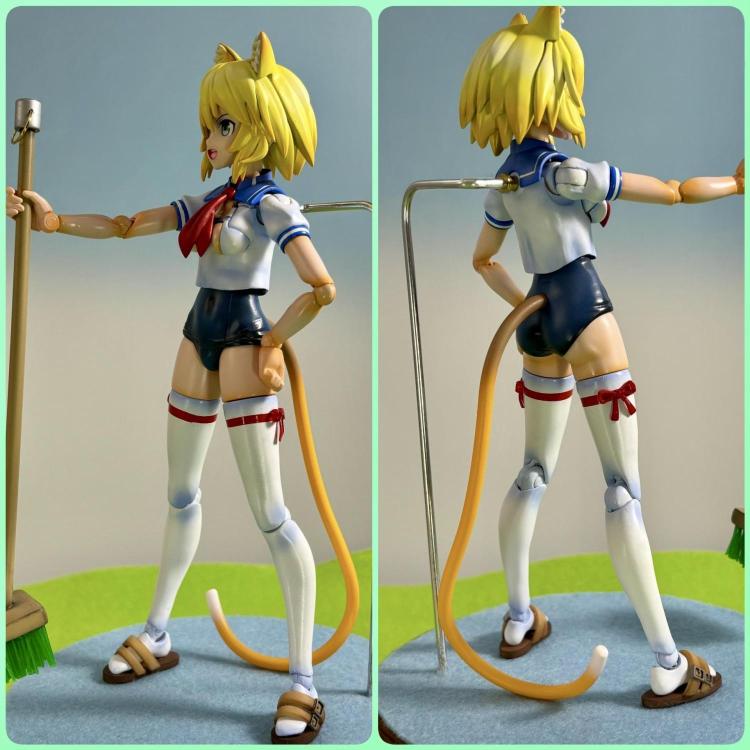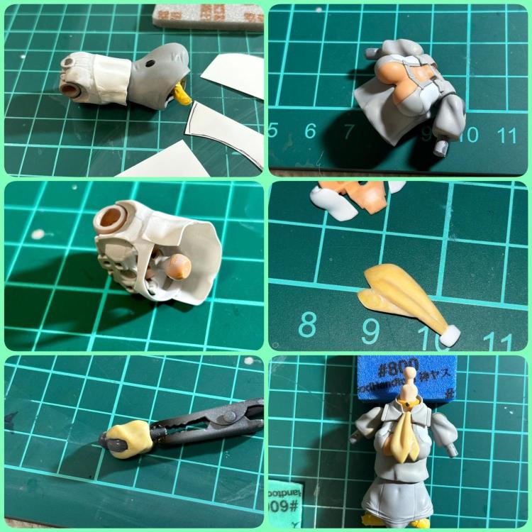 プラ板をエンボスヒーターで加工し納得いく型に整え、服のシワはパテで盛りました。 スカーフはパテで1から制作しています。 肩のセーラー服もパテ盛りで制作しました。
