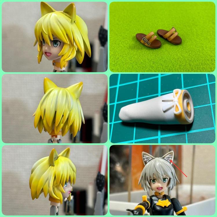 ヘアパーツはリシェッタを使用し加工しました。 猫耳は社外品を使用し2分割にしてあります。 制作日記に記載しましたが、サンダルは大阪に行った時に、「いろしか」さんで購入した物です。 耳毛は制作中に片方が紛失すると言うアクシデントにみまわれ、2回作る事となってしまいました…足にはリボンを付けました。 曲線に合う様に若干加工してあります。